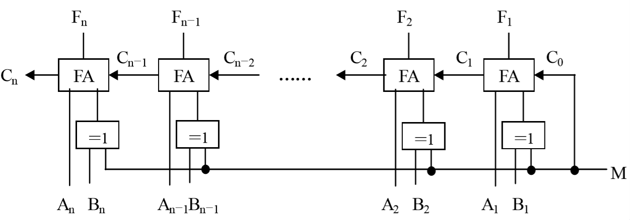 M=0,$Bi\oplus0=B_i$,$C_0=0$,作$A+B$;M=1,$B_i\oplus1=B_i$,$C_0=1$,作$A-B$。电路中刚才用进出符号位的进位进行溢出判断$OVR=C_n\oplus C{n-1}$
