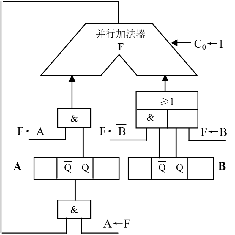 补码加减运算的硬件实现电路基本原理仍是加法器,只要在加法器的$A、B$输入端增加控制信号,即可控制实现加法和减法。因为$B\oplus1=\overline{B}$,所以在需要作减法时,将输入到加法器的$B$端的内容取反后送入加法器,并使最低进位$C_0=1$,即可实现减法运算。
