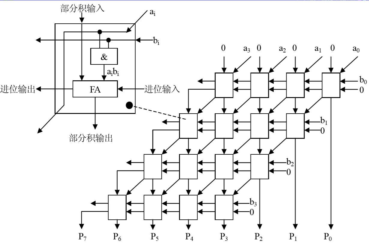 阵列乘法器的基本思想:把大量加法器单元电路按一定阵列形式排列,直接实现手算算式的运算过程,提高速度。