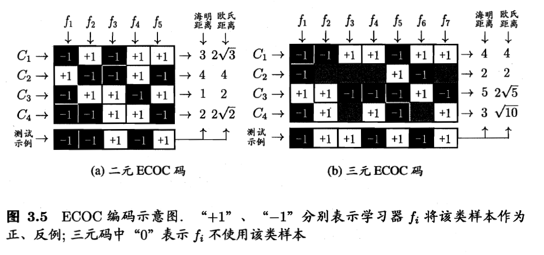 类别划分通过”编码矩阵(coding matrix)”指定。常见的编码矩阵有二元码和三元码,前者将每个类别分别指定为正类和反类,后者还可指定”停用类”。