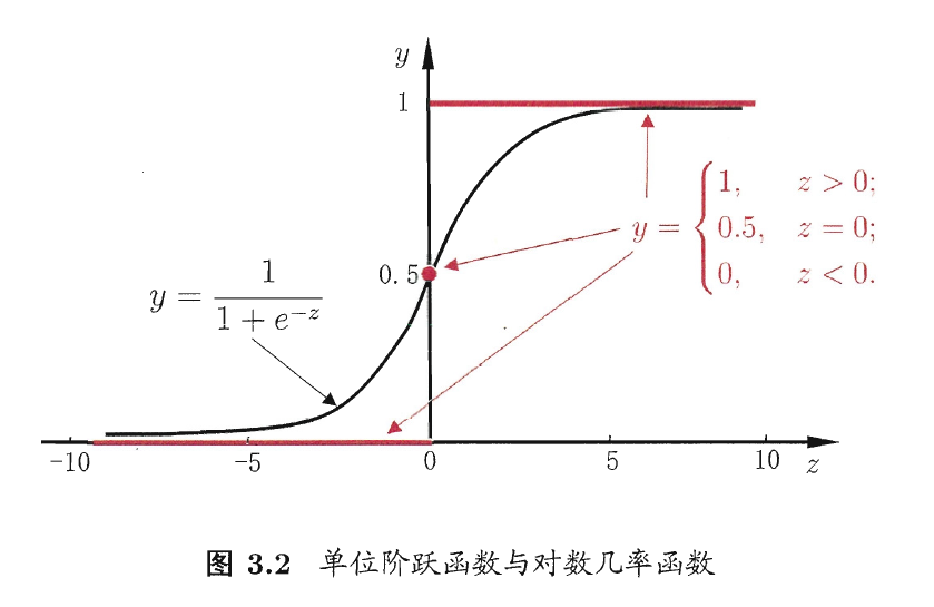 若要做的是分类任务,只需找一个单调可微函数将分类任务的真实标记y与线性回归模型的预测值联系起来。考虑二分类任务,线性回归模型产生的预测值是实值,需将实值转换为0/1值。最理想的是”单位阶跃函数”(unit-step function)