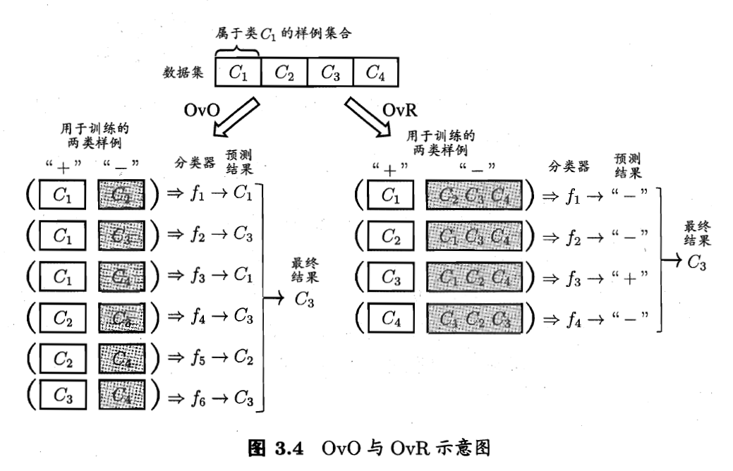 给定数据集$D={(x_1,y_1),(x_2,y_2),\dots,(x_m,y_m)},y_i\in{C_1,C_2,\dots,C_N}$。OvO将N个类两两配对产生N(N-1)/2个二分类任务,OvR每次将一个类的样例作为正例、所有其他类的样例作为反例训练N个分类器。两者各有优劣。