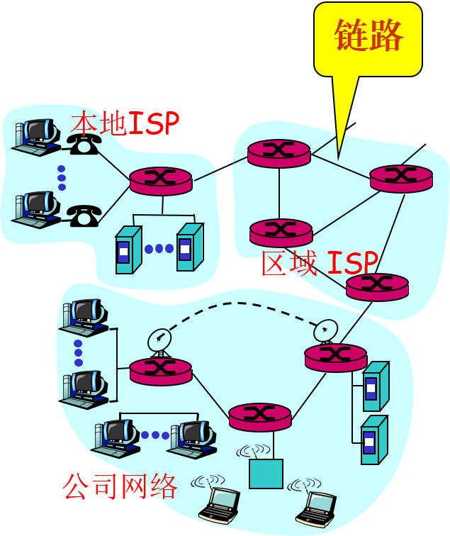 因特网(Internet):一个世界范围的计算机网络,互联遍及全世界的计算设备,是全球性的网络的网络。其具体由硬件(计算机、通信设备、通信链路)和软件(采用五层结构的一系列协议)构成,为分布式应用程序提供通信服务。