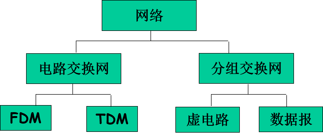 数据报网络:分组交换机根据目的地址转发分组,不需建立连接,每个分组携带目的地址,交换机据此决定下一跳。