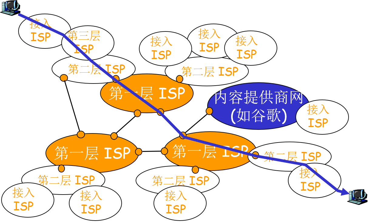 第一层ISP(tier-1 ISP)位于最顶层,数量少,是因特网主干网络,覆盖国际。与一般网络类似,但速率高,ISP之间互相对等(peer),不存在从属关系。