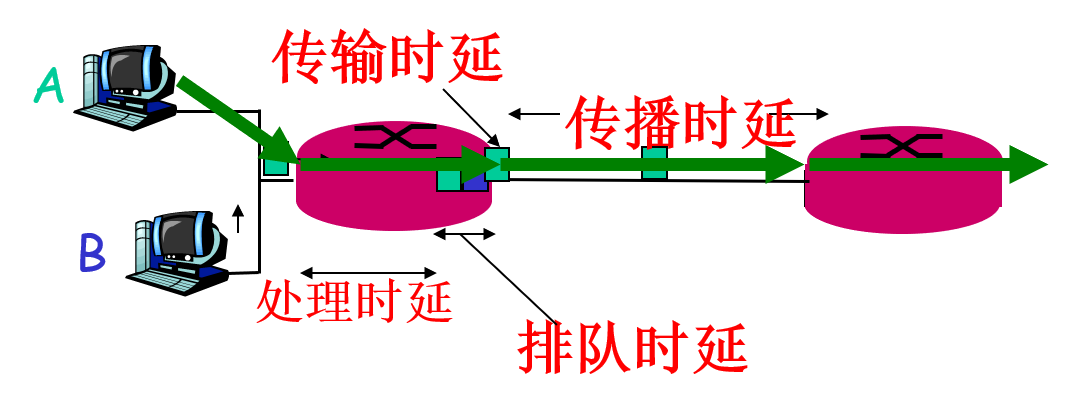 一个节点与一段链路的总时延$d{nodal}=d{proc}+d{queue}+d{trans}+d_{prop}$。