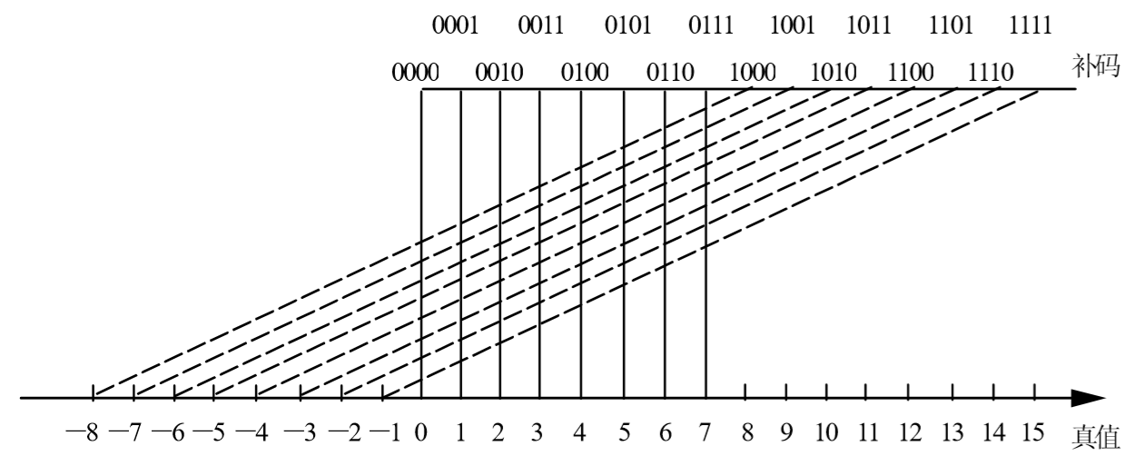 在计算机中把补数称为补码,对于纯小数表示,通常取模$M=2$,对于纯整数表示,通常取模$M=2^n$($n$为字长)。