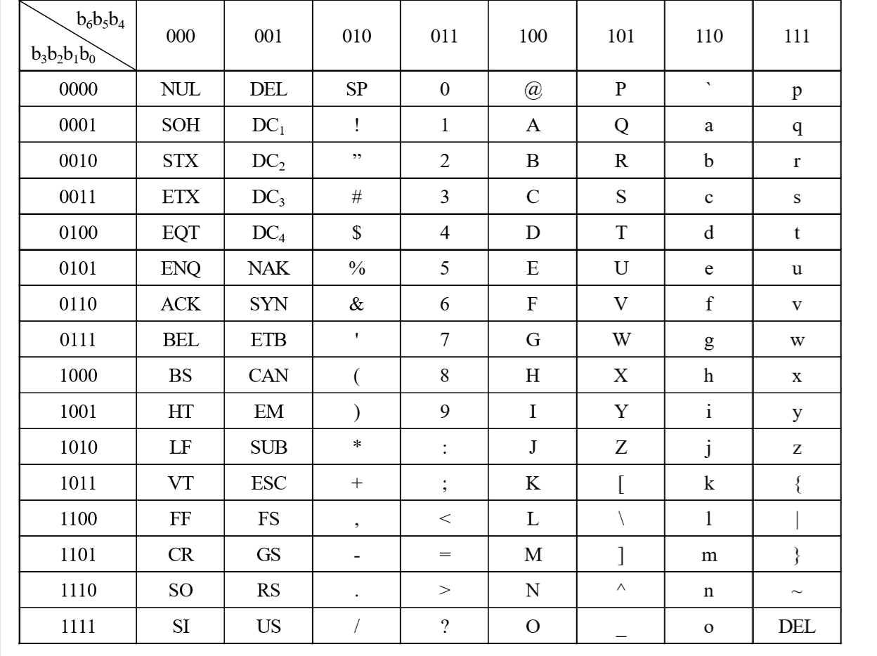 ASCII字符编码的符号排列为$b_6b_5b_4b_3b_2b_1b_0$,其中$b_6b_5b_4$为高位部分,$b_3b_2b_1b_0$为低位部分。
