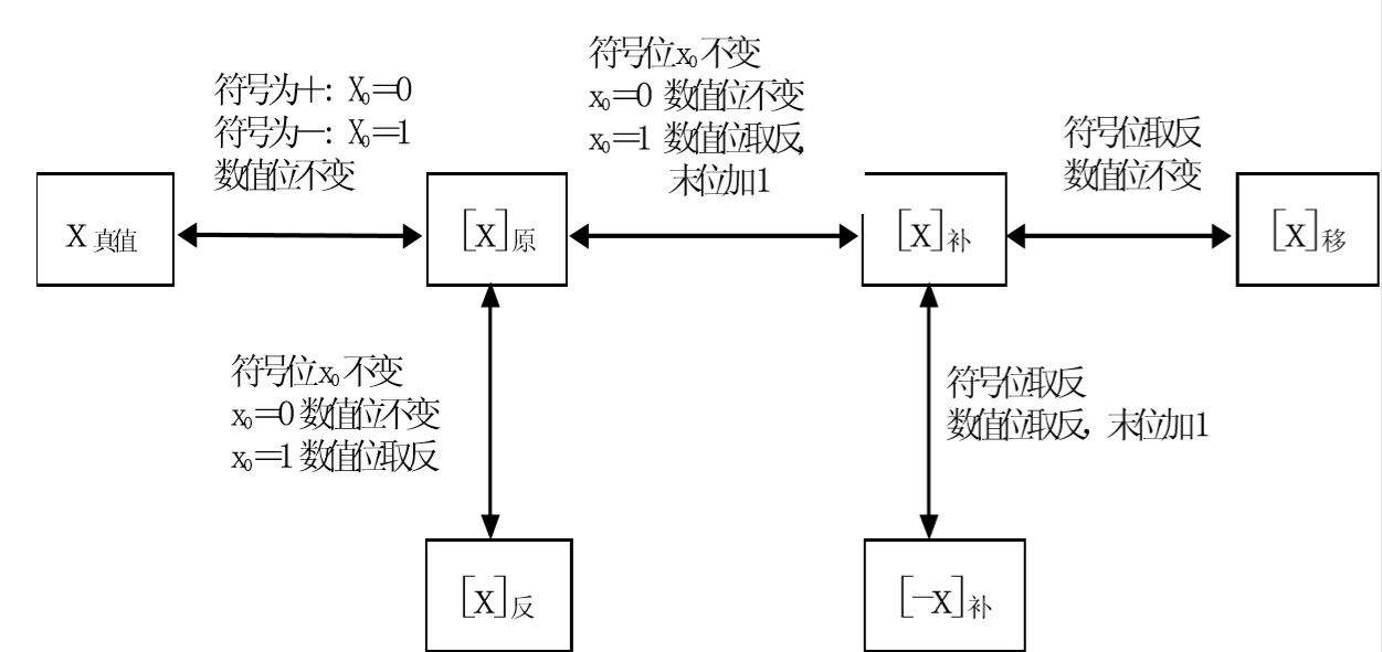 若$x\geq0$,则$[x]反=[x]原$;若$x<0$,则将除符号位以外的$[x]原$各位取反,得到$[x]反$,反之亦然。