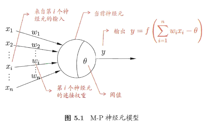 神经网络中最基本的成分是神经元(neuron)模型。如果某神经元的电位超过了一个”阈值”(threshold),那么它就会被激活。上述情形可以抽象为图5.1所示的简单模型,即”M-P神经元模型”。在这个模型中,神经元接收到来自n个其他神经元传递过来的输入信号,这些输入信号通过带权重的连接(connection)进行传递,神经元接收到的总输入值将与神经元的阈值进行比较,然后通过”激活函数”(activation function)处理以产生神经元的输出。