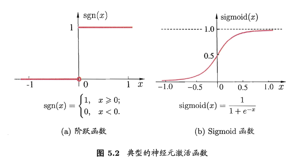 理想的激活函数是图5.2(a)所示的阶跃函数,将输入值映射为输出值”0”(神经元抑制)或”1”(神经元兴奋)。然而碍于其性质,实际常用如图5.2(b)的Sigmoid函数作为激活函数也称为”挤压函数”(squashing function)。